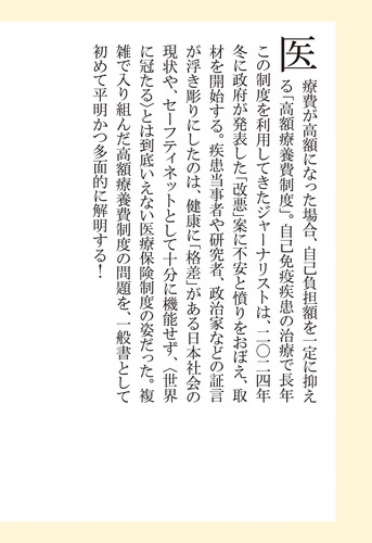 疾患当事者や研究者、政治家などの証言が浮き彫りにしたのは、健康に「格差」がある日本社会の現状や、セーフティネットとして十分に機能せず、〈世界に冠たる〉とは到底いえない医療保険制度の姿だった。複雑で入り組んだ高額療養費制度の問題を、一般書として初めて平明かつ多面的に解明する!