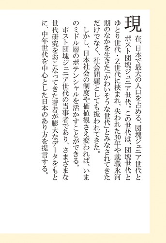しかし、日本社会の制度や価値観さえ変われば、いまのミドル層のポテンシャルを活かすことができる。ポスト団塊ジュニア世代の当事者であり、さまざまな世代研究をおこなってきた著者が膨大なデータをもとに、中年世代を中心とした日本のあり方を提言する。